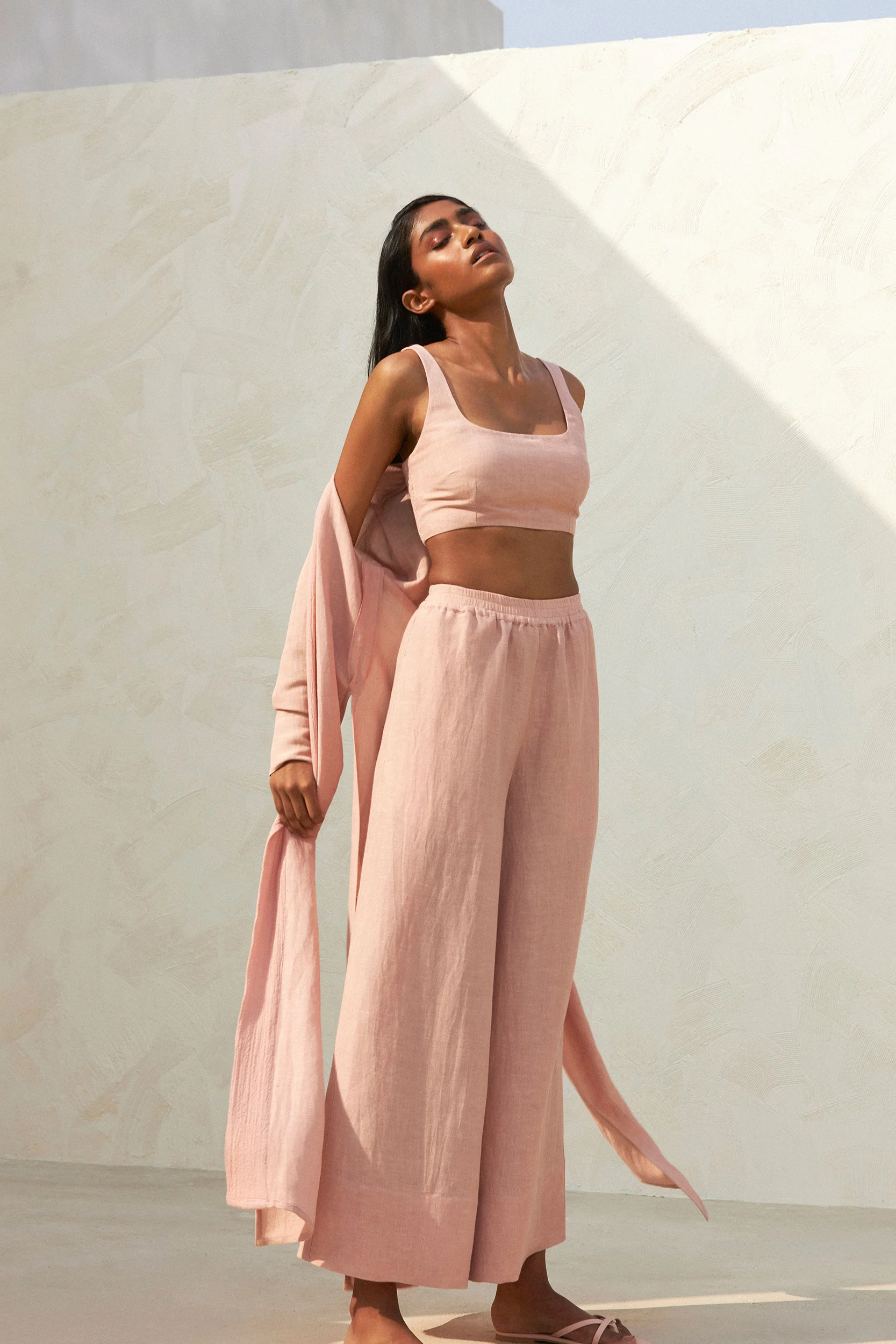 Soft linen, high waist pants, wide legged with expandable elastic waist for comfort and pockets