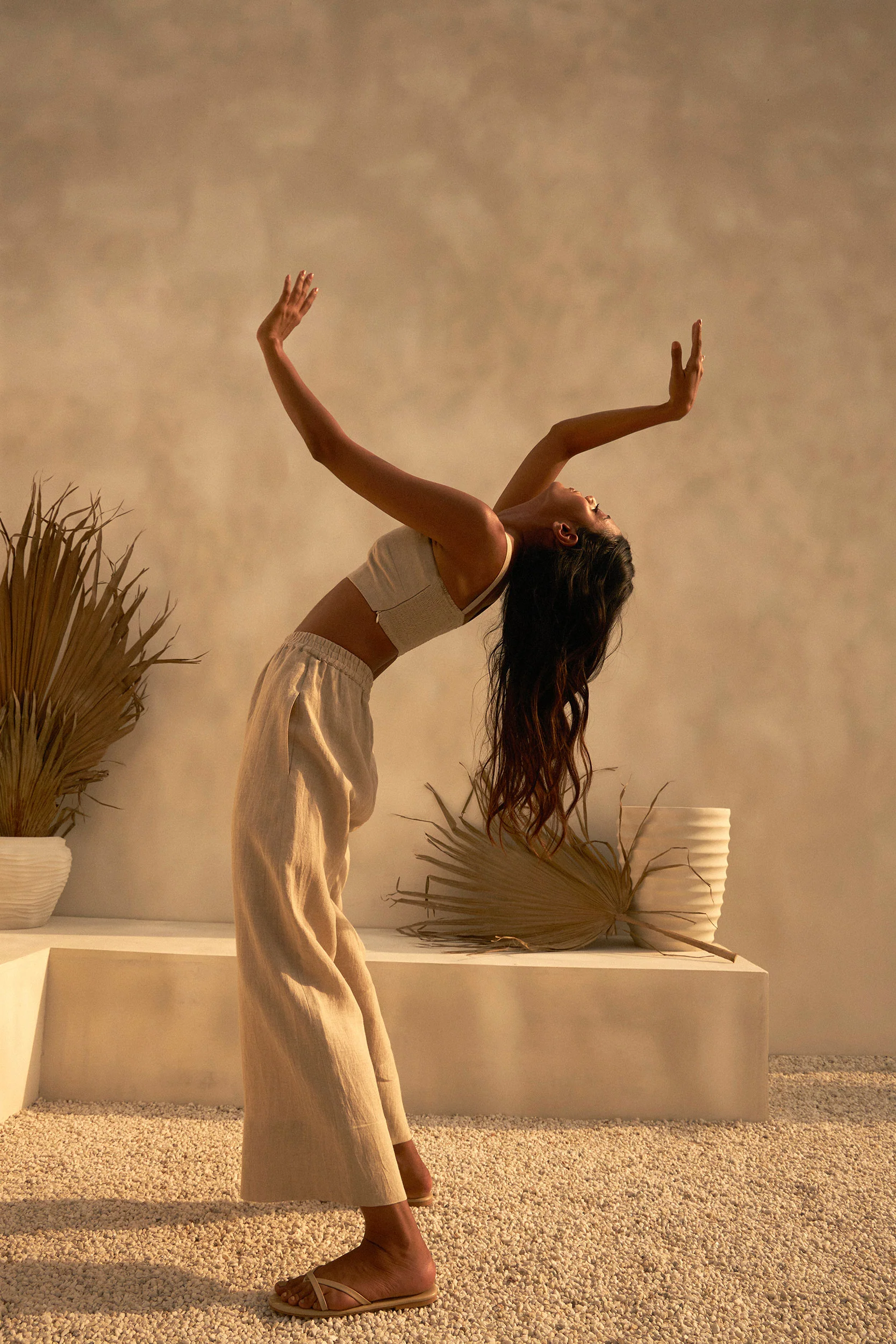 Soft linen, high waist pants, wide legged with expandable elastic waist for comfort and pockets