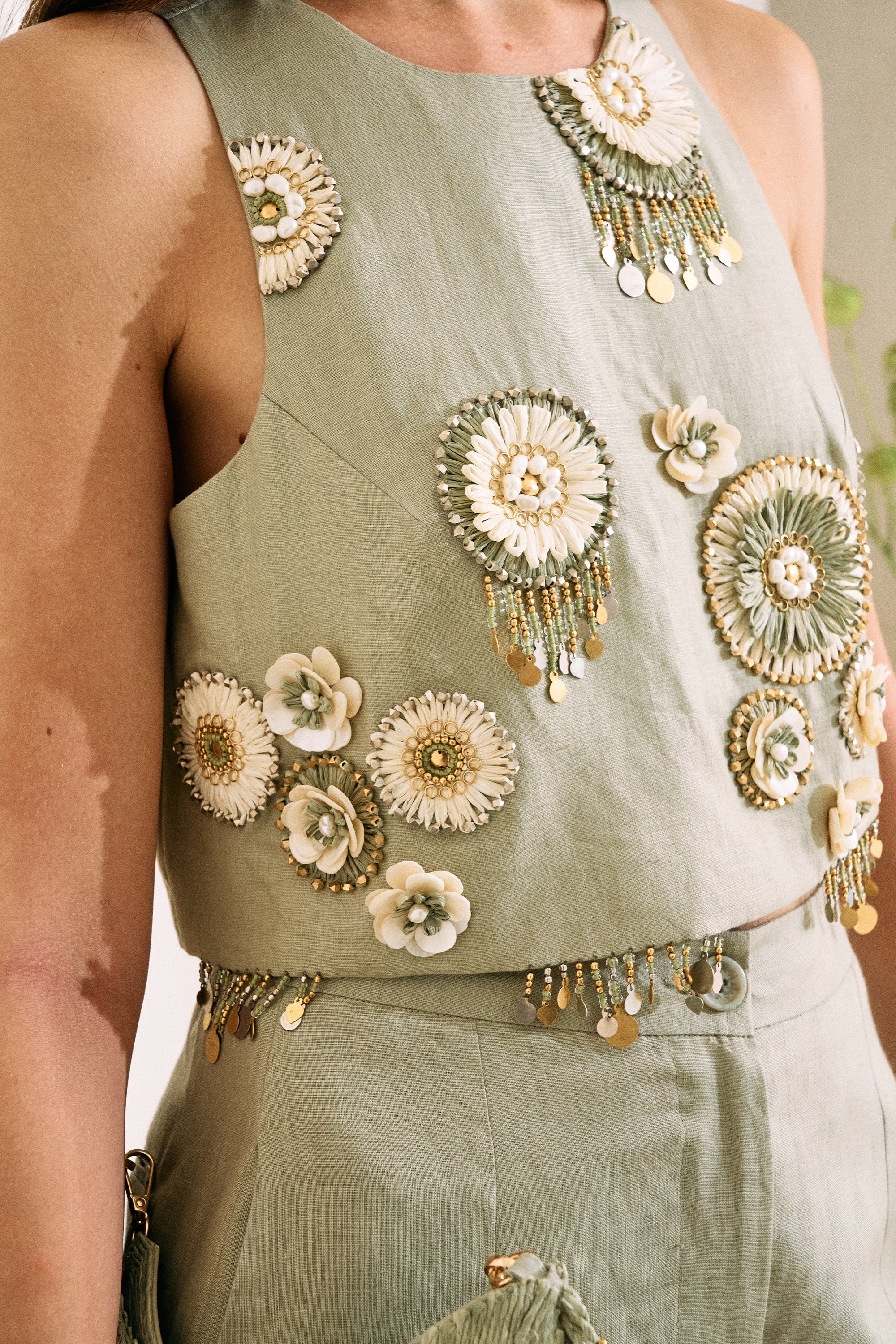 Crafted in 100% linen in an earthy sage hue, this top is embellished with embroidered blooms made from natural raffia, delicate threadwork, faux pearls, and subtle metal accents. Each floral motif is layered for depth and texture, finished with playful metallic drops along the hem that move beautifully with you. The silhouette is clean and structured at the front, while the back features a striking spine of gold metal hooks for an unexpected statement finish. Styling: Pair with our relaxed Wandering linen pants in a barrel cut or a fluid skirt, finish with Elsewhere sandals for a cohesive head-to-toe look. Add the Elsewhere tote bag for a touch of drama.