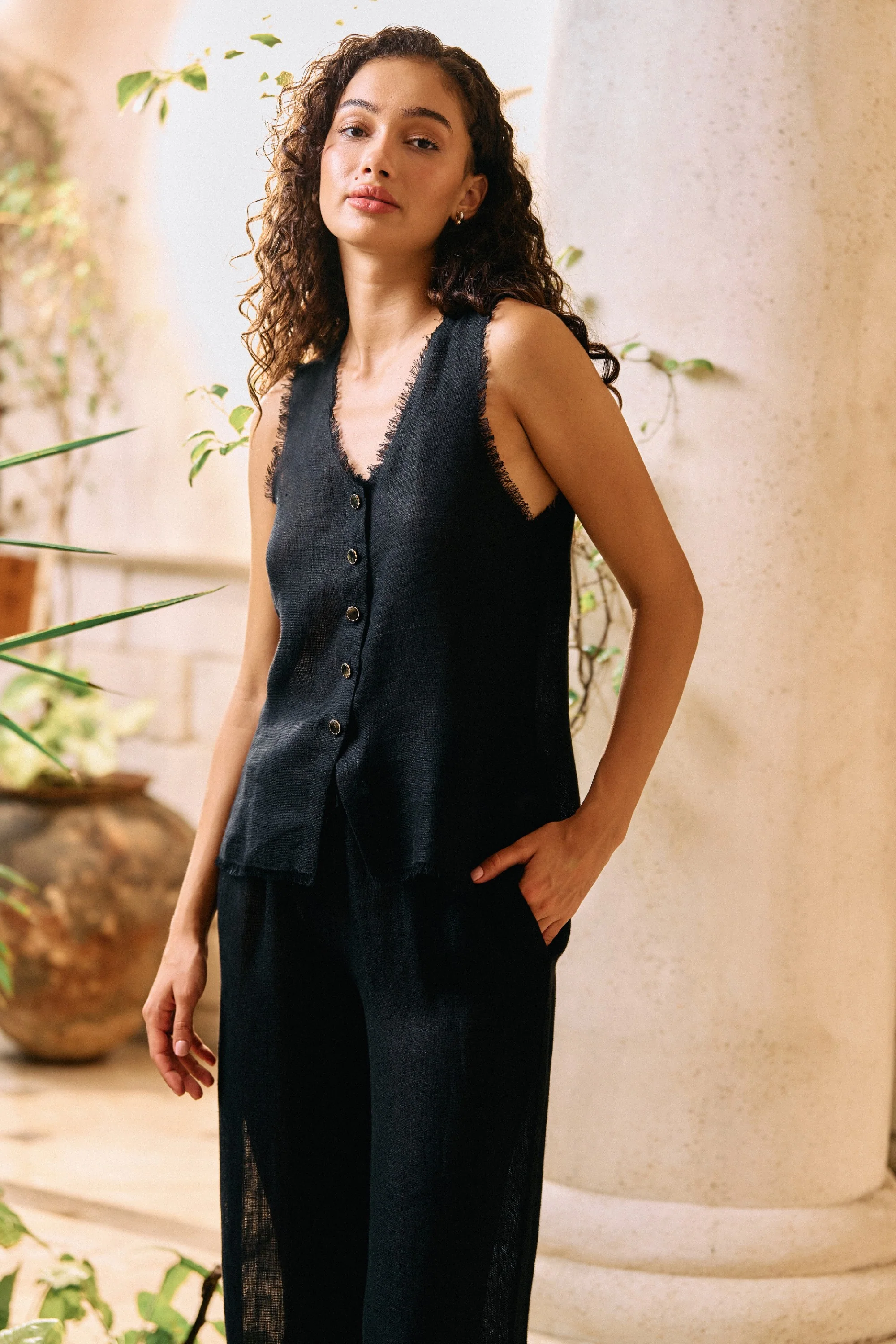 The Unrushed Top (Black) - Crafted in our all-new linen gauze basket weave, this sheer sleeveless top celebrates both surface texture and airy lightness. The V-neck silhouette is finished with raw frayed edges for a softly undone feel, while accent jewelled buttons run down the front for a subtle touch of shine. Designed with a relaxed straight fall, it’s lightweight, breathable, and effortlessly refined, striking a beautiful balance between structure and softness.Click Here